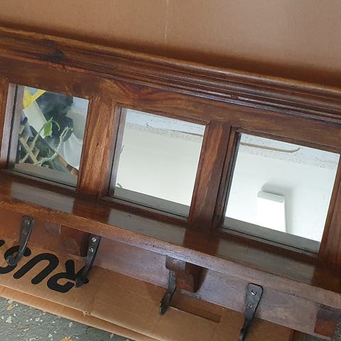 Anslagstavla med hylla/spegel/krokar som går att flytta om. 56x36 cm.