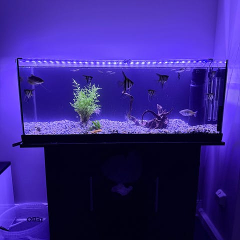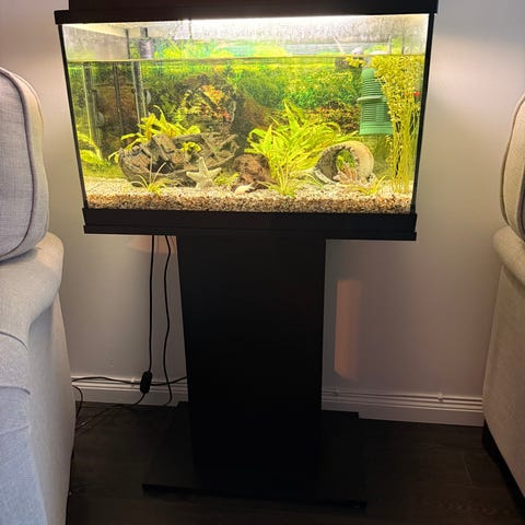 Akvarium med tillhörande ställning och dekorationsinredning. Ett par små fiskar ingår samt filter och termometer. Passar för sötvattensfiskar och liknande. Storlek 60L. Akvariet är bra men i behov av rengörning.