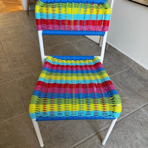 2 st IKEA Färgglad barnstol i flerfärgad plast med vit metallram. Sits och rygg består av flätad plast i flera färger. Barnstolen är avsedd för inomhusbruk och passar till exempel vid barnbord eller i lekhörna. Enkel att torka av och hålla ren. Priset avser för båda.