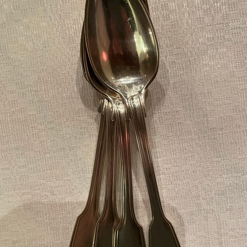 Nysilver - 6 stycken fruktknivar och 5 stycken fruktgafflar (eller smörgåsbestick om man vill kalla det så). De flesta märkta "B". Modell Svensk Spets. Längd knivar drygt 15 cm, längd gafflar knappt 15 cm