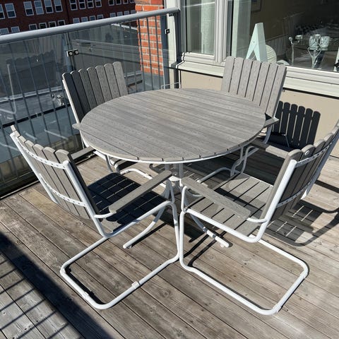 Runt matbord för utomhusbruk med tillhörande fyra stolar. Bordsskivan är uppbyggd av ribbor i ett cirkelformat mönster och är placerad på en metallstomme. Stolarna är svarta med smal metallram och lutande ryggstöd. Passar för användning på balkong, altan eller uteplats som matgrupp eller sittgrupp.