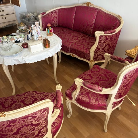 Blandad grupp vintage möbler utan angivet varumärke. Gruppen omfattar ett runt träbord på svarvad fot, en soffgrupp med två gula soffor/fåtöljer med mönstrad klädsel, ett mindre sidobord med marmorskiva samt ett par röda högryggade fåtöljer i tyg med matchande fotpall. Möblerna är i äldre stil och har stått i biljardhall.
