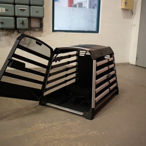 Packline hundbur i metall med svart finish. Buren är rektangulär med galler framtill och täta sidor och ovansida. Konstruktionen består av metallrör och skivor, anpassad för placering i bilens bagageutrymme eller inomhus. Framtill finns dörr med galler som kan öppnas för att släppa in och ut hunden. Mått framgår delvis av bilderna med måttstock, vilket ger en uppfattning om höjd, bredd och djup. Avsedd för transport eller viloplats för hund.