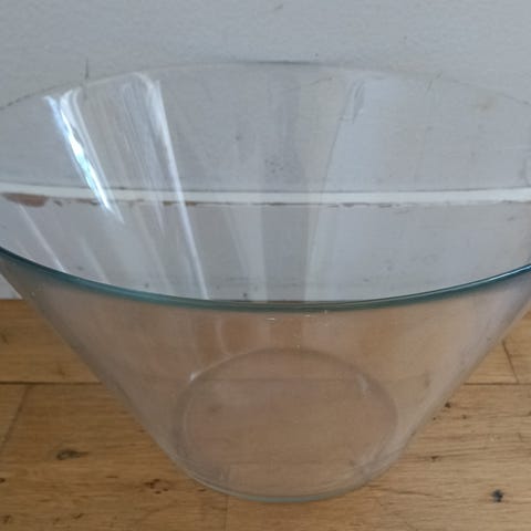 Stor serveringsskål i glas från IKEA. Har ett litet nagg längst upp vid kanten. Skålen har en konisk form och är lämplig för servering eller förvaring av mat.