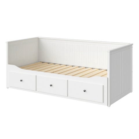 IKEA säng med förvaring i vit färg. Sängen har utdragslådor undertill för extra förvaringsutrymme. Passar i sovrum eller barnrum där man vill kombinera sovplats med praktisk förvaring, samt möjlighet till gäster. Materialet är träbaserat med slät, vit yta.