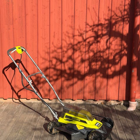 Ryobi batteridriven gräsklippare i grön färg. Modellen har fyrhjulskonstruktion och hopfällbart handtag för enklare förvaring. Till gräsklipparen hör uppsamlare samt batteriladdare, enligt bilderna. Passar för klippning av gräsmattor i hemmamiljö där man vill använda en sladdlös lösning med batteridrift.