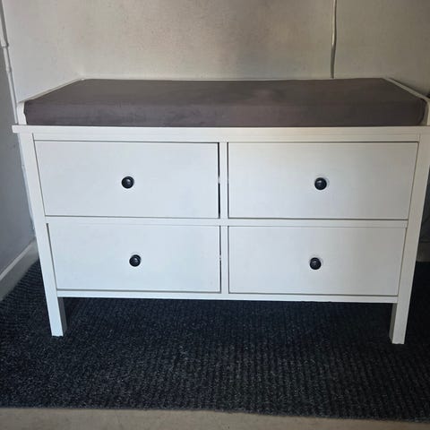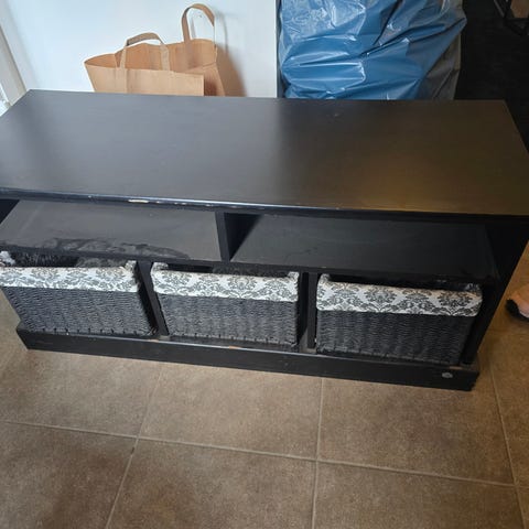 Svart hallmöbel med förvaringskorgar. Dynan är omklädd, oklart vad som finns under. Hämtas i centrala Luleå.