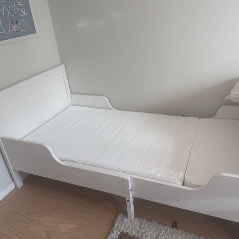 IKEA utdragbar barnsäng i vit färg. Sängen är en utdragbar modell som kan justeras i längd efter barnets behov. Passar som övergångssäng från spjälsäng till större säng. Madrassdelar som följer sängens utdragbara funktion syns på bilderna. Lämplig för ett barnrum där man vill kunna anpassa sängens storlek över tid.