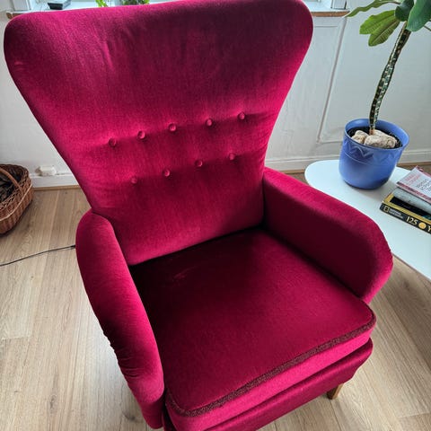 Fåtölj från 1950-talet i fint skick, omklädd av möbeltapetserare till rött tyg tidigt 2010-tal. Påminner om Carl Malmstens Solo och farmor, men nättare i framtoningen. Kudde för svanken i samma tyg som fåtöljen medföljer.