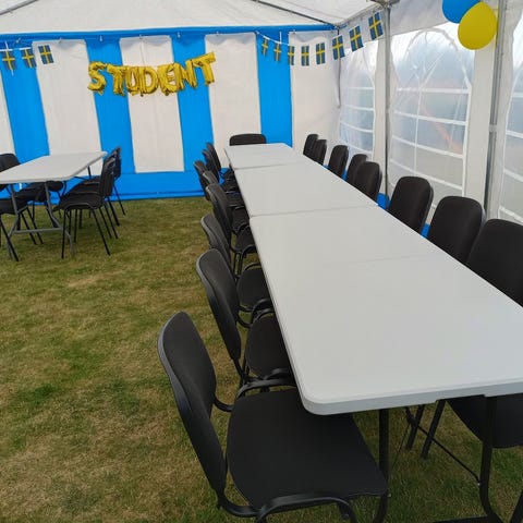 Det kan vara bra att ha en duk på borden. Alla stolar är vita klappstolar men kan ha lite olika design.