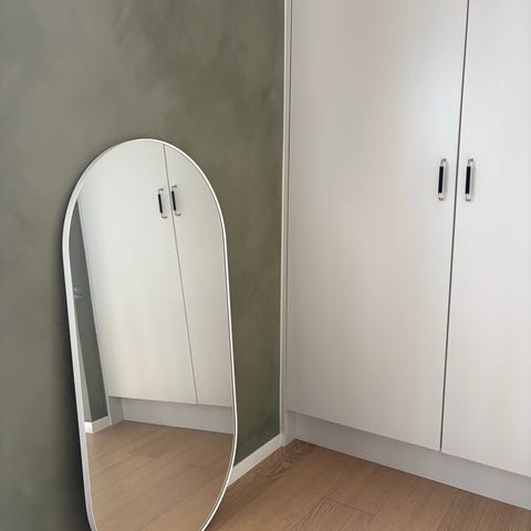 IKEA rektangulär spegel med rundade hörn. Spegeln är helkroppsstorlek och är avsedd att stå mot vägg eller monteras på vägg, beroende på önskemål och tillbehör. Passar i hall, sovrum eller vardagsrum för helkroppsspegling och som inredningsdetalj.