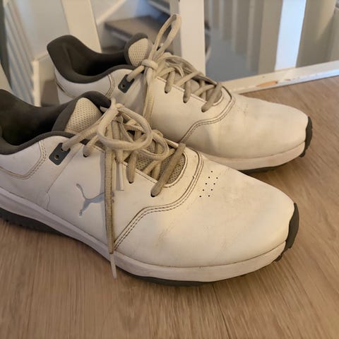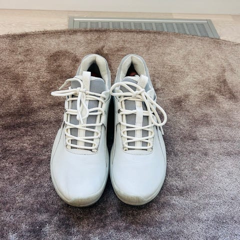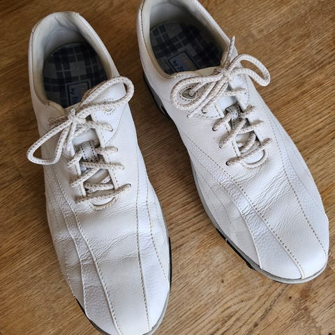 Golfskor från Ecco i äkta läder, yttersula med utbytbara softspikes för grepp på golfbanan. Innersula i läder med arch support och shock point. Lågt skaft och vadderad hälkant för ökad komfort. Sparsamt använda!