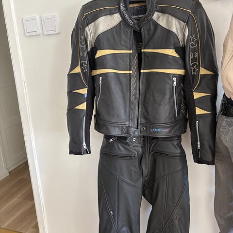 Svart/brun MC-ställ från Halvarssons. Jackan har en dragkedja framtill och två fickor med dragkedja. Byxorna har en rak passform och är försedda med dragkedja och knappstängning. Både jackan och byxorna har ett rutigt innerfoder i svart och vitt.