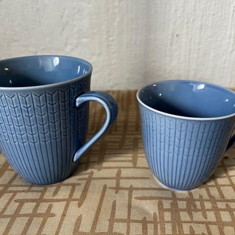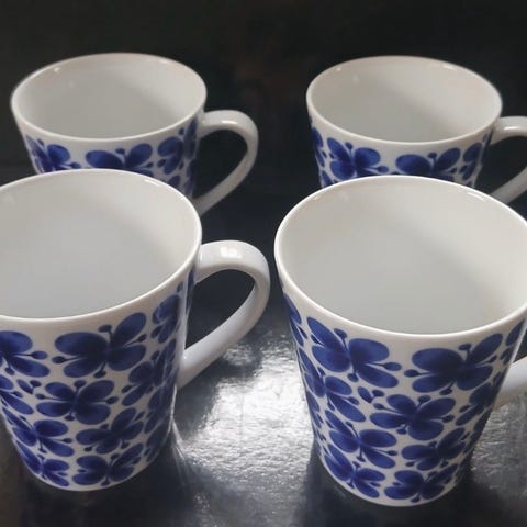 Rörstrand Ostindia Floris muggar i blått porslin. Muggarna har ett blått mönster på utsidan och vit insida. Passar för servering av varma drycker som kaffe, te eller choklad i kök och matsal. Designen är en del av Rörstrands serie Ostindia Floris.