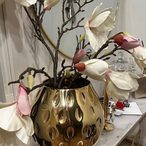 H&M vas i guldfärgat glas. Rund modell med vertikal räfflad struktur. Passar för snittblommor, torkade växter eller som dekorativ inredningsdetalj på bord eller hylla.