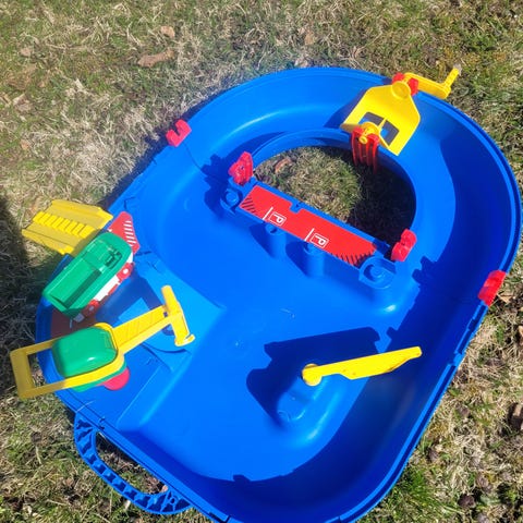 En oanvänd sandlåda/pool varav ena halvan har delvis varit nergrävd.