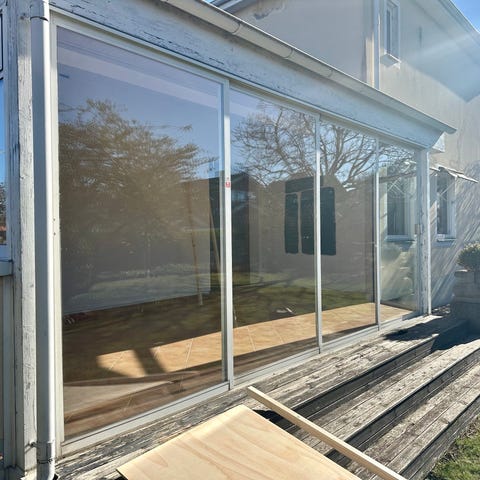 Inglasat uterum med skjutbara partier i glas och vitlackerade profiler. Ca 3x4 meter.