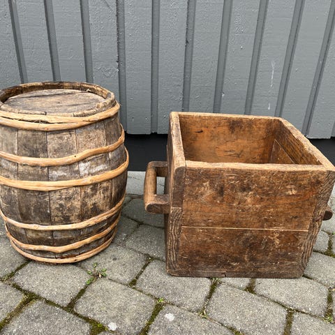 Trätunna, den har stått ute i vinter. Gångjärnet på locket är trasigt.