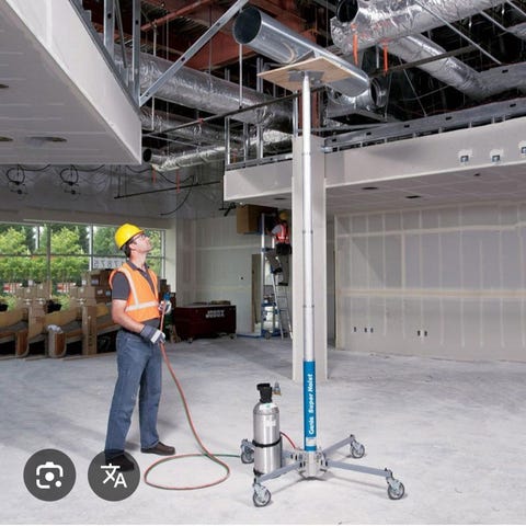 Starke Arvid materiallyft med manuell vinsch. Lyftstativ i metall med teleskopisk mast och vev för höjdjustering. Utrustad med vajer och krok för lyft av material på byggarbetsplats eller liknande användningsområden. Stativet har stabil fotkonstruktion för användning på plan yta.