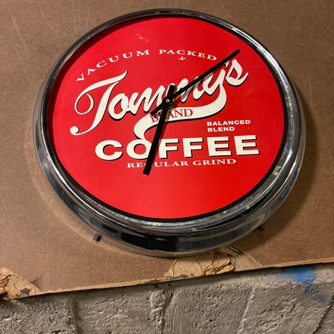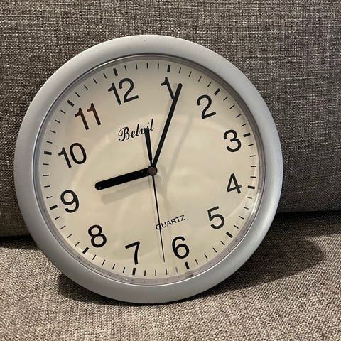 Rund väggklocka i svart med vit ram. Klockan har stora siffror, tre visare och glasfront. Passar för användning i hemmet, till exempel i vardagsrum, kök eller hall.