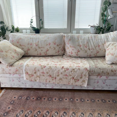 Bäddsoffa, funkar men tyget behöver bytas. Lånade bilder från nätet, är isärmonterad. Komplett i övrigt.