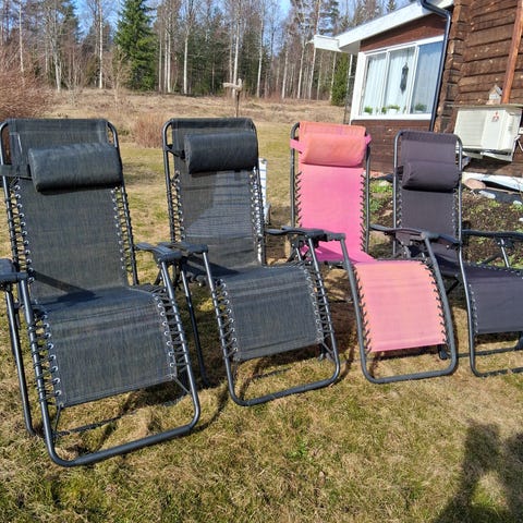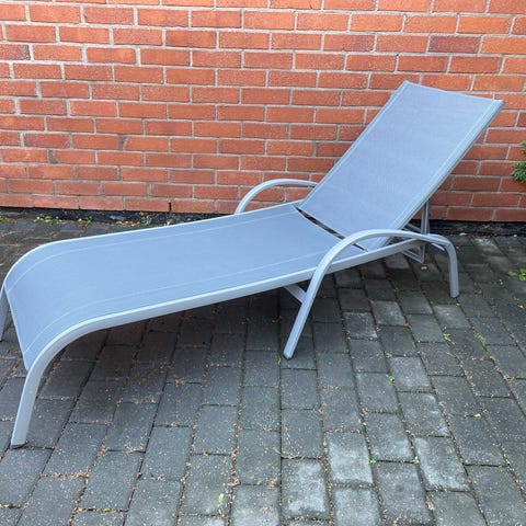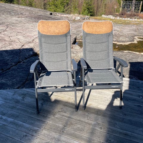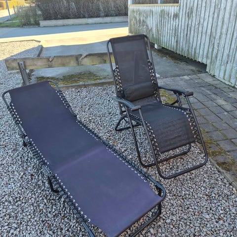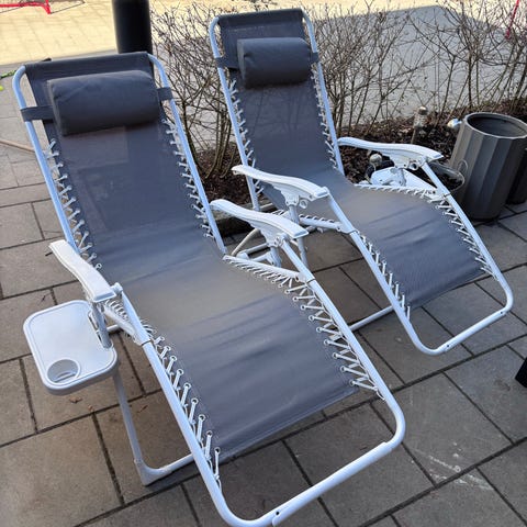Fällbara solstolar i grå textil med svart metallstomme. Stolarna har armstöd och justerbar rygg, stolarna är utrustad med nackkudde. Passar för användning på altan, balkong eller uteplats.