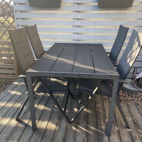 Svart matgrupp utomhus med 4 stolar