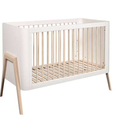 Vit stilren spjälsäng i skandinavisk design. Täckta gavlar och snyggt skurna ben i naturfärgad björk är detaljer som ger det lilla extra. Ställbar botten i tre lägen.