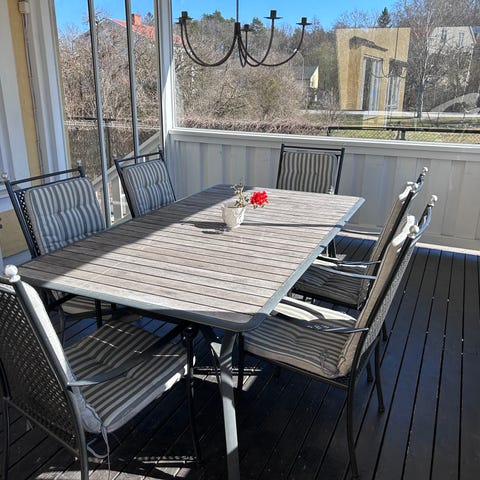 Stolarna har svart sits och är tillverkade i rostfritt stål och odlad teak av högsta kvalitet. Sits och rygg är en plastväv som tillverkas av franska företaget Ferrari vars väv har det registrerade varumärket Batyline. Denna väv är mycket hållbar eftersom den är armerad och får då en låg töjbarhet. Har en hög resistens mot UV och mögel och klarar upptill -35C. Batyline förblir sval även när solen ligger på samtidigt som den torkar direkt efter regn tack vare glesheten i väven. Även skruvar/beslag i rostfritt stål. Stolen är stapelbar. Dyna Vreta eller Uni passar till.
