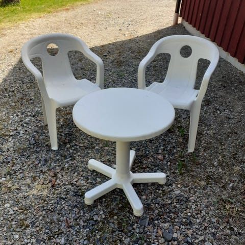 Vit trädgårdsgrupp med rektangulärt plastbord och stapelbara plaststolar. Bordsskivan har hål i mitten för parasoll. Möbelgruppen är lämplig för uteplats, altan eller trädgård. Mått på bordet framgår delvis av bilderna med tumstock, ungefärlig längd runt 160 cm. Stolarna är i vit plast och kan staplas för enklare förvaring.