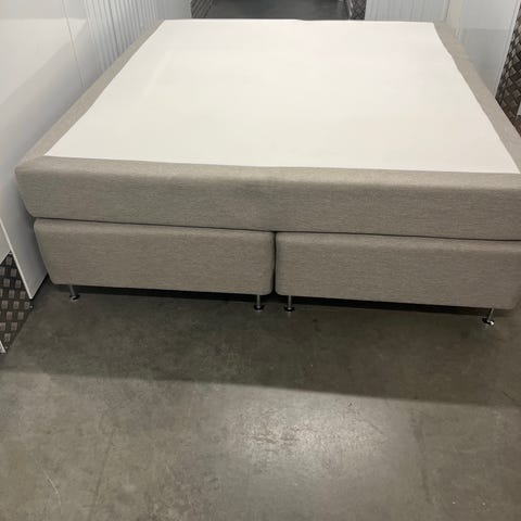 Viking Beds kontinentalsäng med bäddmadrass i svart tyg. Sängen består av två underdelar med gemensam resårdel ovanpå samt en vit bäddmadrass märkt "Supersoft". Sängen står på metallben. Kontinentalsängen är avsedd för två personer och ger ett sammanhängande liggplan med extra komfort genom den tjocka bäddmadrassen. Passar som dubbelsäng i sovrum eller gästrum.