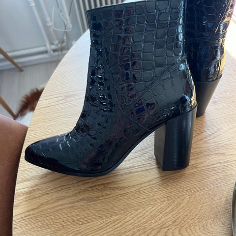 Zara klackskor i form av höga stövlar i svart färg, storlek 39. Skorna har grov sula och klack samt spänndetalj vid ankeln. Passar till vardag och enklare utomhusbruk under svalare årstider.
