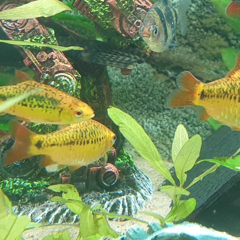 De bor just nu i ett 240l akvarium och de bör inte bo mindre då de är duktiga simmare!