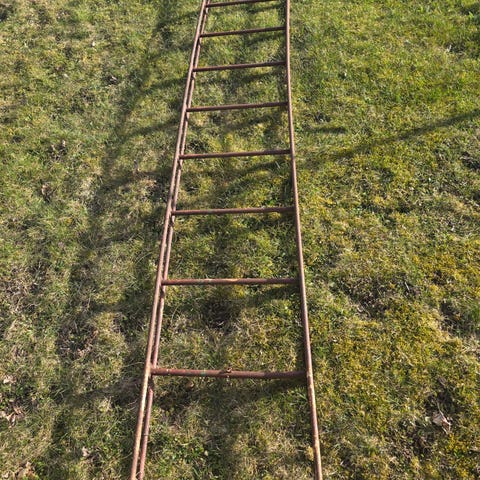 Stege i metall i brun färg. Rak modell med flera steg, lämplig för exempelvis arbete mot vägg eller byggnad där en enklare stege behövs. Passar för utomhusbruk beroende på skick och behov. Längd 3 meter
