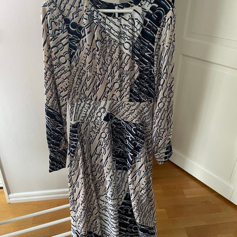 Diane von Fürstenberg vardagsklänning i viskos i storlek 36. Klänningen har omlottmodell med knytband i midjan och mönster i flerfärgad ton med kontrast mellan ljusa och mörka partier. Lång ärm och knälång längd, lämplig som vardagsklänning eller för enklare tillfällen. Materialet är viskos och plagget är avsett för professionell kemtvätt enligt skötselrådsetiketten.
