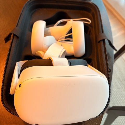Meta Quest VR‑headset med tillhörande handkontroller i vit färg. Headsetet har inbyggda linser och justerbart huvudband. De två trådlösa handkontrollerna har styrspakar, knappar och handledsremmar. Systemet används för virtuell verklighet och fungerar för spel och andra VR‑upplevelser där användaren rör sig fritt och interagerar med den virtuella miljön via kontrollerna och huvudrörelser.