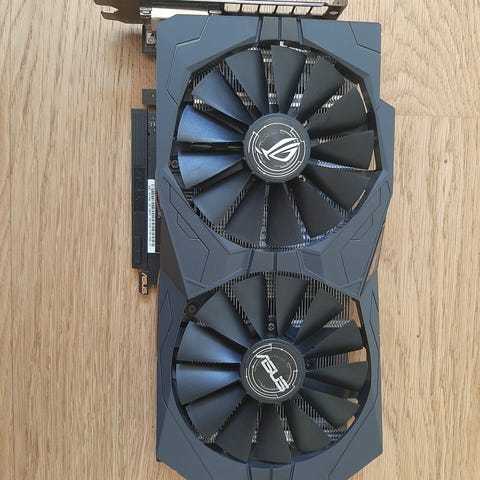 Asus ROG Strix grafikkort i svart utförande. Kortet har trippelfläktkylning på framsidan och en bakplåt med ROG Strix-design på baksidan. Ansluts via PCIe-kontakt. Passar stationära datorer som stödjer PCIe-grafikkort. Exakta tekniska specifikationer som minnesmängd och modellbeteckning framgår inte av bilderna och bör kontrolleras vid behov.