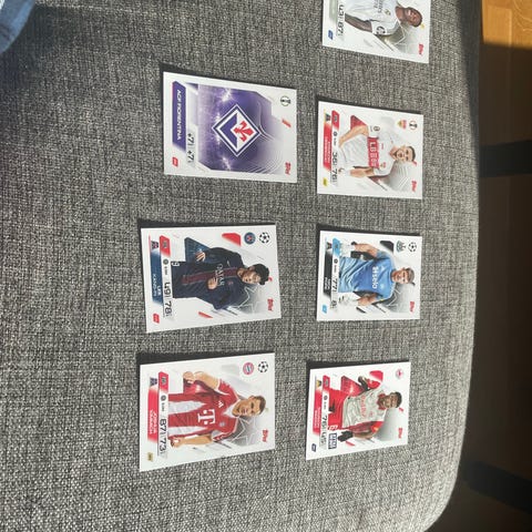 Panini fotbollskort Champions League spelarkort med blandade motiv. Setet på bilden visar fyra olika spelare från europeiska klubblag. Kortens framsida har spelarfoto, klubbmärke, namn och olika statistikvärden. Passar för samling eller byte av fotbollskort.
