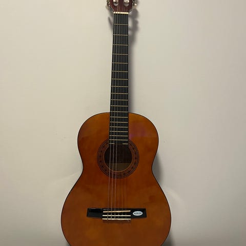 Klassisk akustisk gitarr i naturträutförande. Gitarren har sex strängar, rund resonanslåda och dekorativ rosett runt ljudhålet. Huvudet har öppna stämskruvar med vita stämskruvsknappar. Kropp och hals är i trä med blank finish. Passar för spel med nylonsträngar och är lämplig för exempelvis klassisk musik, visor och ackompanjemang.