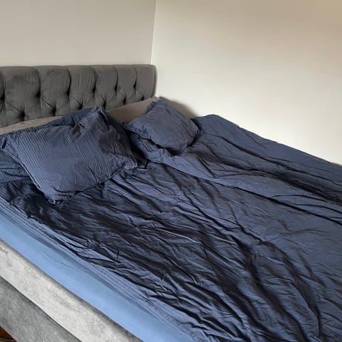 Kontinentalsäng 180 cm bred, 200 cm lång och 64 cm hög. Använd endast som gästsäng i ett djur och rökfritt hem..