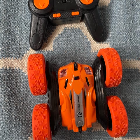 Tuff radiostyrd stunt bil som kan köra på båda sidorna och snurra runt 360 grader. Bilen är lika rolig att köra med inomhus som utomhus. Den är 16 cm lång och kommer med en greppvänlig och enkel handkontroll anpassad för barns händer