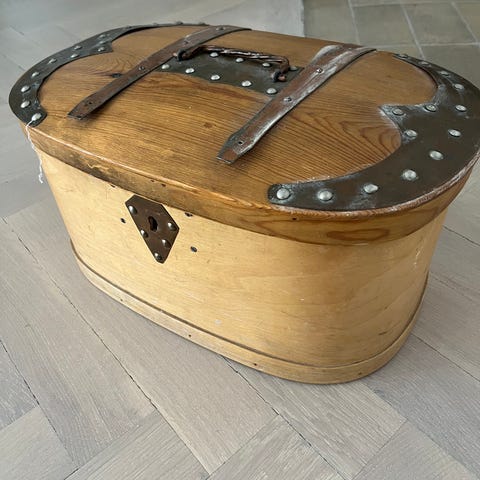 Trälåda med handmålad dekor på lock och framsida. Lådan har gångjärnsförsett lock och invändiga fack. Passar för förvaring av sybehör eller småsaker i hemmet.