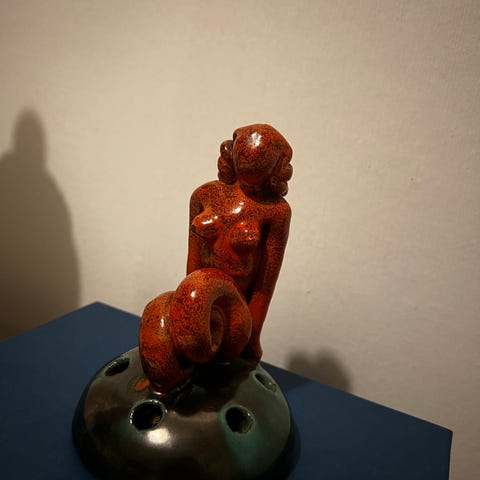 Skulptur i keramik, mor och dotter. Mörk finish med gulddetaljer.