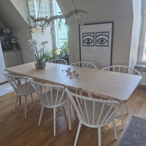 Nu säljer jag mitt fina matbord mot om och men. Detta bord är så himla fint och stabilt och kan göras väldigt långt med iläggskivorna. Skivorna är i fint skick och smälter in i hela bordet.