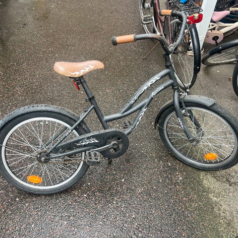 Köptes ny fel säsong men egentligen knappt använd innan dags för storlek större. Har dock stått ute hela tiden så kedjan ser brun ut (men fungerar) och vinden blåst ner den så korgen är skev (kan tas bort).