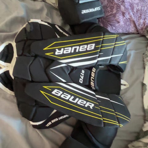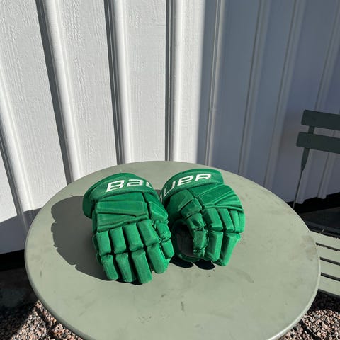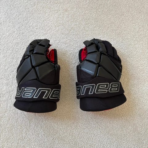 Bauer ishockeyhandskar i svart färg. Handskarna är vadderade och utformade för ishockeyspel med skydd för hand och handled. Passar för användning vid träning och match på is. Materialet är en kombination av textil och syntet med förstärkningar i handflatan för bättre grepp om klubban. Priset är per st.