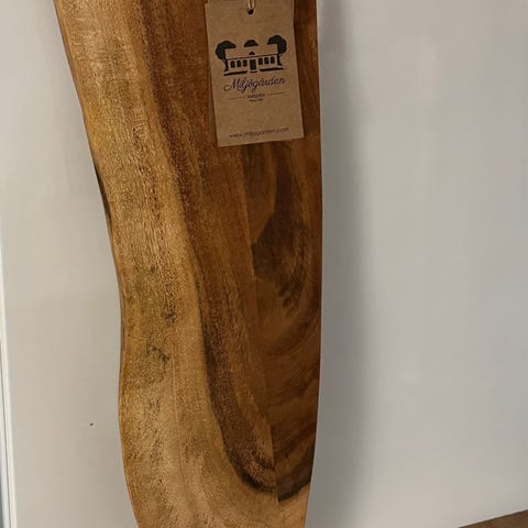 Skärbräda I ändträ med fiskbensmönster. Mått ca 32×40×3,5 cm. Tillverkade av återvunnet material.