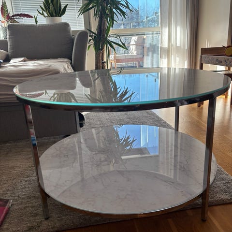 Nancy soffbord vit marmormönstrat glas, underrede kromad metall, ø80 H45