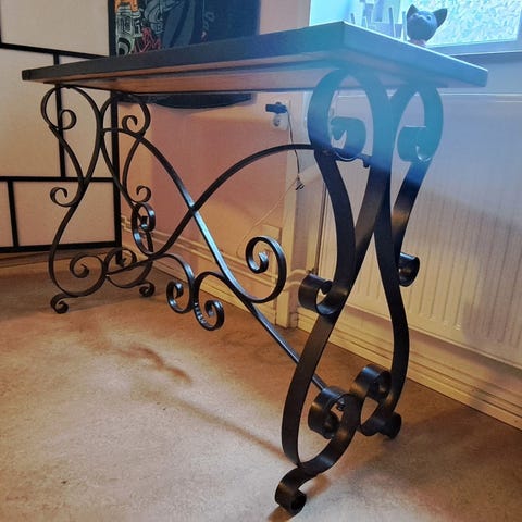 Säljer en vin bar med en bordskiva. Går att ha vin flaskor under bordskivan. Finns en liten spricka i glaset se bilder ovan.