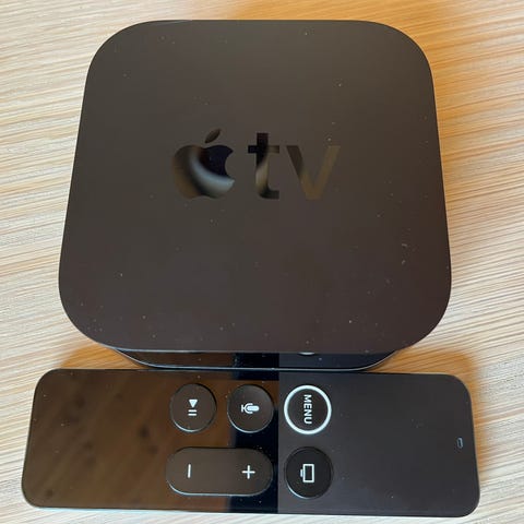 Apple TV mediaspelare i svart utförande. Enheten ansluts till TV via HDMI för strömning av digitalt innehåll. Medföljer fjärrkontroll för navigering i menyer och styrning av uppspelning. Lämplig för användning med kompatibla Apple-tjänster och appar för film, serier, musik och annan media.
